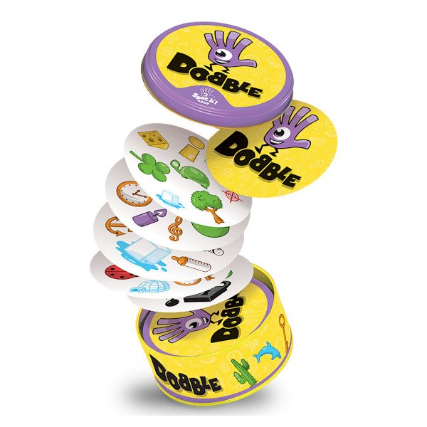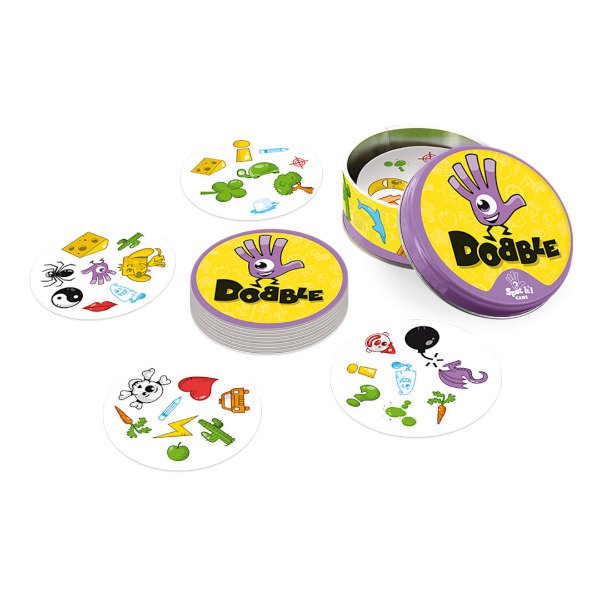 Dobble es un juego de cartas que se basa en la velocidad, observación y reflejos, en el que los jugadores compiten por encontrar el símbolo que coincide entre las cartas. Más de 50 símbolos y 55 cartas, con uno, y solamente un símbolo idéntico entre cada carta. ¿Serás capaz de descubrirlo? Si tenés un par de minutos, tenés tiempo para un Dobble. Un juego que se salta las barreras generacionales, que podés jugar con toda la familia sin restricciones. Apto para niños a partir de 3 años, pero igual de adictivo se tenga la edad que se tenga. En cada una de sus 55 cartas encontrás 8 objetos dibujados, con la particularidad que si tomás dos cartas al azar siempre se va a repetir uno de los objetos en ambas.